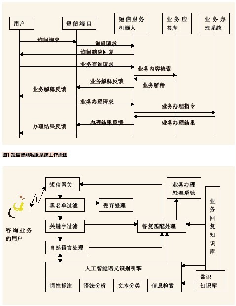 人工智能技術(shù)的引入讓機(jī)器能替代人工服務(wù)為用戶提出的問題和請求做出類人的處理和反饋。在計(jì)算機(jī)系統(tǒng)上實(shí)現(xiàn)人工智能的有兩種不同的方式。一種是工程學(xué)方法,采用傳統(tǒng)的編程技術(shù),使系統(tǒng)呈現(xiàn)近似人類智能的輸出結(jié)果,并不考慮所用方法是否與人或動(dòng)物機(jī)體所用的方法相同。另一種是模擬法,它不僅要獲得類人的輸出結(jié)果,還要求實(shí)現(xiàn)方法也和人類或生物機(jī)體所用的方法相同或相類似。目前主要在工程學(xué)方法實(shí)現(xiàn)人工智能中有較成熟的商用技術(shù),短信自助服務(wù)系統(tǒng)也基于該方法實(shí)現(xiàn)。