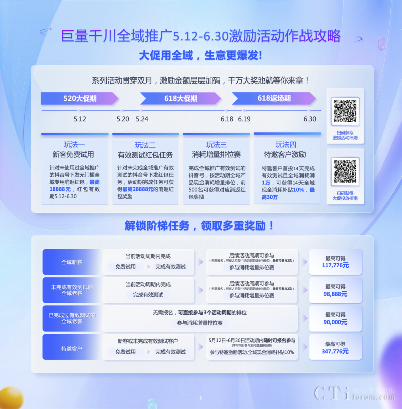 在此次巨量千川618好物節(jié)期間,全域推廣系列活動貫穿雙月,激勵金額層層加碼,更有多重獎勵,獎池金額累積千萬。全域推廣針對全域新客發(fā)放高達18888元的全域推廣專屬紅包;對于未完成全域有效測試的商家在活動期完成有效測試任務(wù)可獲得最高28888元的消返紅包;以及參與全域推廣消耗排位賽,最高可得50000元消返紅包;對于特邀客戶首投14天完成有效測試且全域消耗滿1萬,可獲得14天全域現(xiàn)金消耗補貼10%,最高達30萬。