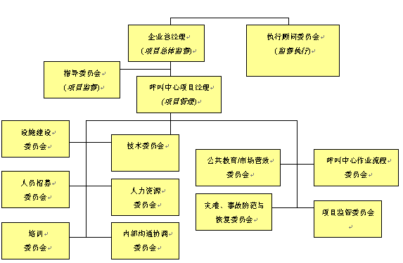 。。對(duì)于呼叫中心建設(shè)項(xiàng)目實(shí)施的規(guī)劃是一個(gè)需要付出巨大心血與努力的階段,這個(gè)階段需要企業(yè)或組織機(jī)構(gòu)所有人員的廣泛參與和專(zhuān)家意見(jiàn)。對(duì)于呼叫中心運(yùn)營(yíng)的規(guī)劃,相對(duì)與呼叫中心建設(shè)項(xiàng)目而言則顯得有些"特殊",它意味著整個(gè)呼叫中心建設(shè)項(xiàng)目團(tuán)隊(duì)不可能有全部的時(shí)間花費(fèi)在運(yùn)營(yíng)規(guī)劃議題上。因此,我們可以將全部項(xiàng)目規(guī)劃工作與任務(wù)拆分成若干個(gè)規(guī)劃細(xì)項(xiàng),這將保證有較強(qiáng)的可操作性。我們建議采取的方式是將整個(gè)項(xiàng)目實(shí)施規(guī)劃團(tuán)隊(duì)拆分成負(fù)責(zé)各個(gè)專(zhuān)項(xiàng)實(shí)施的小組委員會(huì)或附屬委員會(huì)。這些小組委員會(huì)將集中關(guān)注各自特定的項(xiàng)目實(shí)施上,當(dāng)有需要時(shí),與其他各小組進(jìn)行交流與溝通,并在相關(guān)問(wèn)題上達(dá)成一致。按照以上項(xiàng)目組織管理架構(gòu)其目的是,在項(xiàng)目實(shí)施的關(guān)鍵環(huán)節(jié)和領(lǐng)域,能產(chǎn)生出更具深度的規(guī)劃方案。這樣操作同時(shí)可以使更多的人員參與進(jìn)來(lái),并有利于增強(qiáng)各個(gè)小組的責(zé)任感,有助于項(xiàng)目的成功實(shí)施。以下的項(xiàng)目指導(dǎo)委員會(huì)組織架構(gòu)不是任何呼叫中心建設(shè)項(xiàng)目都能適用的,但是它在某種程度上已經(jīng)為呼叫中心項(xiàng)目規(guī)劃提出了一個(gè)基本方針,按照這個(gè)思路它將保證項(xiàng)目的成功實(shí)施。而對(duì)于規(guī)模較小的呼叫中心項(xiàng)目,以上的組織架構(gòu)成員將扮演多重角色,并負(fù)責(zé)多項(xiàng)任務(wù)項(xiàng)目的實(shí)施。就呼叫中心項(xiàng)目規(guī)劃與實(shí)施團(tuán)隊(duì)而言,應(yīng)由若干個(gè)負(fù)責(zé)不同領(lǐng)域?qū)嵤┑男〗M來(lái)組成,以便確保呼叫中心建設(shè)項(xiàng)目的所有領(lǐng)域,及各個(gè)階段的有效實(shí)施。呼叫中心項(xiàng)目規(guī)劃與實(shí)施組織架構(gòu)請(qǐng)見(jiàn)下圖。