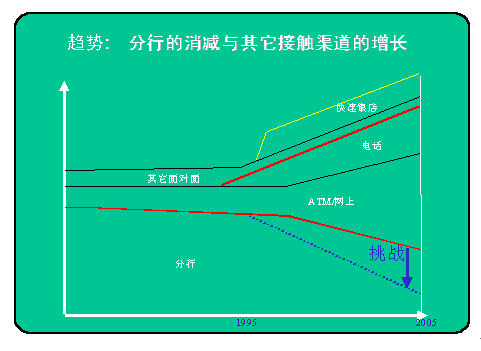 。。下圖為國外專家對銀行不同客戶服務(wù)渠道發(fā)展比例的說明。可以看到,營業(yè)廳的比例在逐年下降,而國外不少銀行甚至將進(jìn)一步壓縮營業(yè)廳比例作為一項渠道的任務(wù)。電話銀行也就是通過IVR實(shí)現(xiàn)的自助服務(wù),自然是呼叫中心的一部分,但人工服務(wù),包括對上網(wǎng)及其它互動方式的客戶提供的座席代表服務(wù),當(dāng)然更是現(xiàn)代呼叫中心業(yè)務(wù)的一部分,圖上雙紅線內(nèi)所表示的正是不斷發(fā)展的呼叫中心的所占比例。