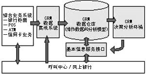在CRM數(shù)據(jù)倉庫中,實(shí)際數(shù)據(jù)分為操作數(shù)據(jù)和分析模型。操作數(shù)據(jù)包括客戶基本信息、客戶賬務(wù)信息和操作控制(客戶個(gè)性化服務(wù)信息)。分析模型包括客戶關(guān)系管理的所有分析模型、市場(chǎng)分析、客戶信用度分析、客戶滿意度分析和銷售行為分析。因此,CRM的主體部分將通過數(shù)據(jù)集成系統(tǒng)與業(yè)務(wù)處理部分(綜合柜面系統(tǒng)等)和客戶聯(lián)系部分(呼叫中心等)連接起來。同時(shí),由于業(yè)務(wù)處理部分一般都采用銀行的現(xiàn)有系統(tǒng),而呼叫中心則可以成為一個(gè)相對(duì)獨(dú)立的模塊,因此,銀行CRM系統(tǒng)的實(shí)施主要體現(xiàn)在CRM數(shù)據(jù)集成系統(tǒng)、CRM數(shù)據(jù)倉庫、CRM決策分析環(huán)境、基本信息服務(wù)接口等四大部分。