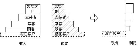 科特勒根據(jù)客戶的忠誠度給了我們一個階梯,這是客戶關(guān)系管理工作的良好參照,同時也可作為客戶關(guān)系管理工作考核的工具。我們將這個階梯做如下改造:每個層次的寬度是此級次客戶的數(shù)量,每個層次的高度是此級次客戶給企業(yè)帶來的收入,我們可以得到一個企業(yè)收入客戶分布結(jié)構(gòu)圖,如右圖所示: 從圖中可以很清楚的看出客戶管理工作的內(nèi)容:層次寬度(每個層次客戶的數(shù)量)和層次的高度(每個層次客戶的平均贏利水平)。 |