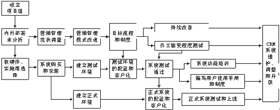 一個CRM系統(tǒng)的建設(shè)所經(jīng)過的歷程,可以用圖1所示。漢普管理咨詢(中國)有限公司的CRM系統(tǒng)的實施就是按照這個路線進(jìn)行的,主要從管理的調(diào)整和信息系統(tǒng)的建設(shè)兩個方面著手。