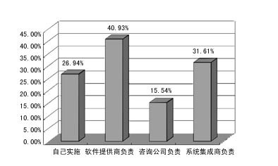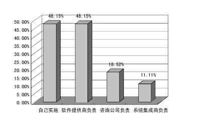 在用戶如何實施CRM系統(tǒng)的調(diào)查中,已應(yīng)用CRM的單位一般都是由自己或軟件提供商負(fù)責(zé),而沒用CRM的企業(yè)則大多期望能由軟件提供商負(fù)責(zé)。這說明,用戶實施CRM的主體意識還不夠強。