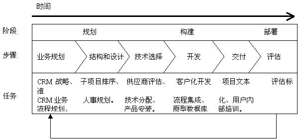 CRM規(guī)劃圖包括三個主要的項目開發(fā)階段:規(guī)劃、構(gòu)建、部署;它還以“分布驟”為特色,包括許多固定的和可變的任務,簡單介紹如下: