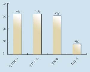 在問到實施周期上,有9家表示希望在3個月內完成,占到47.4%,有6家接受3~6個月的周期,超過6個月的周期已經顯得太長。在問到CRM的實施效果上,有9家認為對公司運營效率有很大提高,8家認為作用一般,只有2家認為沒有作用。表明基本上企業(yè)認可CRM的作用。在問到是否有專門人員負責CRM時,有6家表示有專門部門,有6家有專門人員,合計占62%,說明企業(yè)非常重視CRM的應用。