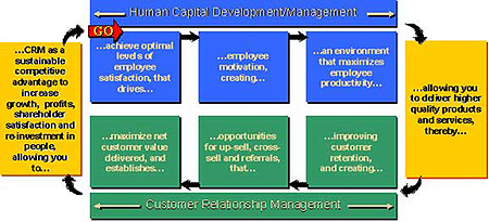 從工作的組織方法到人員雇用,再到一個(gè)角色如何影響客戶的工作描述、根據(jù)對(duì)公司確立CRM的貢獻(xiàn)如何進(jìn)行獎(jiǎng)勵(lì)、雇員發(fā)展、管理勞動(dòng)力信息等等,統(tǒng)統(tǒng)都是成功CRM的一部分。
