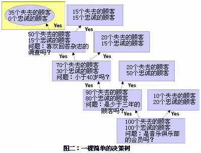 你可以從它的名字中猜到,決策數(shù)是一種樹型分析模型。樹枝代表了用來(lái)定義或者細(xì)分客戶的不同問題。比如,假設(shè)一家音樂俱樂部想要分析為什么一些會(huì)員不會(huì)再次申請(qǐng)它的會(huì)員資格(該俱樂部會(huì)員采取月申請(qǐng)制)。為了形成決策樹,公司召集了一批由100個(gè)忠誠(chéng)顧客、100個(gè)非忠誠(chéng)或者已經(jīng)公司已經(jīng)失去的顧客組成的測(cè)試小組。然后,公司開始提出一系列問題,要求顧客形容一下忠誠(chéng)的顧客和非忠誠(chéng)的顧客是什么樣子的。整個(gè)決策樹就如圖二所示。