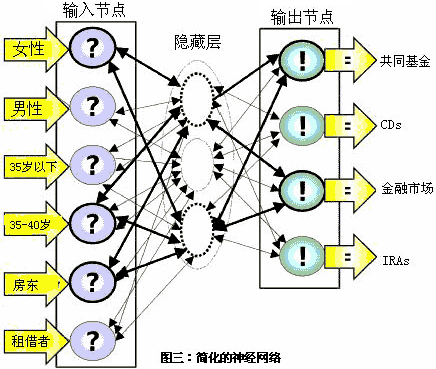 假設(shè)該集團(tuán)的數(shù)據(jù)組包括了100000個(gè)現(xiàn)有和潛在的顧客。數(shù)據(jù)組中所有成員至少滿足一個(gè)列示于每個(gè)輸出節(jié)點(diǎn)邊上的特征條件,比如說,他們的年齡小于35歲或者是在35-40之間,男性或者女性,房東或者租借人。BPN從所有的輸入節(jié)點(diǎn)中獲得數(shù)據(jù),并且以此編譯一個(gè)預(yù)測(cè)型模型。這個(gè)簡(jiǎn)單的模型告訴使用者,年齡在35-40歲之間的男性房東最有可能購(gòu)買共同基金和金融市場(chǎng)產(chǎn)品。這是BNP能預(yù)測(cè)的信息。