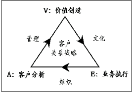 在全球CRM最佳實踐中有一種被稱作CRM"魔三角"的原理,備受企業(yè)的青睞。如下圖所示,構(gòu)成三角形三個頂點的,分別是"A"客戶分析、"V"價值創(chuàng)造和"E"業(yè)務(wù)執(zhí)行,它們反映客戶關(guān)系管理的全部內(nèi)容;構(gòu)成三角形三條邊的分別是"AV"管理、"VE"文化和"EA"組織,它們代表與客戶關(guān)系管理內(nèi)容相適應(yīng)的運營環(huán)境及其方法。