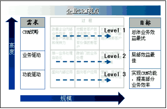 從全球CRM最佳實(shí)踐來(lái)看,企業(yè)實(shí)施CRM不外乎CRM軟件功能驅(qū)動(dòng)、業(yè)務(wù)驅(qū)動(dòng)和客戶關(guān)系戰(zhàn)略驅(qū)動(dòng)三種情況。所以,實(shí)施CRM的視點(diǎn)也有三種,如下圖所示:一是,從CRM產(chǎn)品功能角度,根據(jù)產(chǎn)品所能提供的功能,選擇自己需要實(shí)施的CRM內(nèi)容。這種視點(diǎn)充其量只能夠讓企業(yè)擁有部分CRM的功能,有限地提高部分業(yè)務(wù)處理的效率。二是,從業(yè)務(wù)角度出發(fā),通過(guò)局部?jī)?yōu)化業(yè)務(wù)流程,實(shí)施CRM。在項(xiàng)目中所涉及的業(yè)務(wù)流程可能要貫穿多個(gè)CRM功能模塊。這種視點(diǎn)解決了一部分業(yè)務(wù)問(wèn)題,它主要以流程效益或部門效益最優(yōu)為目標(biāo)。三是,從企業(yè)CRM戰(zhàn)略角度出發(fā),從總體、全局、發(fā)展的高度規(guī)劃和實(shí)施CRM。CRM戰(zhàn)略驅(qū)動(dòng)視點(diǎn)不僅追求局部效益最優(yōu),而且能夠?qū)崿F(xiàn)企業(yè)總體業(yè)務(wù)效益的最大化。雖然,企業(yè)可以根據(jù)自身客戶關(guān)系管理的實(shí)際情況選擇CRM視點(diǎn)的高度,但是在絕大多數(shù)企業(yè)的實(shí)踐中,都會(huì)選擇CRM戰(zhàn)略高度作為著眼點(diǎn),規(guī)劃企業(yè)客戶關(guān)系管理。