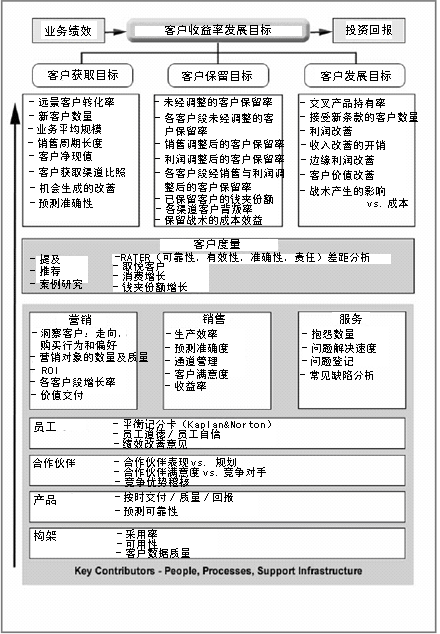 Buttle 教授所著《中端市場CRM》一書中發(fā)現(xiàn)的。它們按縱向排列,最頭上是客戶收益率及發(fā)展目標。下面是對其進行支持的度量方法,此外還提供了一些關鍵指標用以指示策略是否起作用或需要調整。當然我知道你能投入更多,不過我建議你專注于那些能夠直接影響到CRM遠景與策略的度量方法。如果你發(fā)現(xiàn)以前的度量方式成了障礙,那么就把它們清除掉。