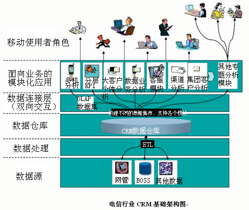 電信行業(yè)早期的CRM系統(tǒng)主要是由單一的多維分析子系統(tǒng)組成,比如移動(dòng)總公司最早的CRM系統(tǒng)就僅僅規(guī)范了以多維分析為標(biāo)準(zhǔn)的九大主題分析。隨著移動(dòng)電信市場(chǎng)的迅速增長(zhǎng),復(fù)雜程度越來(lái)越高,更多的子系統(tǒng)被添加進(jìn)來(lái),IT系統(tǒng)建設(shè)中模塊化的思路通過數(shù)據(jù)集市的方式在CRM建設(shè)中體現(xiàn)明顯。