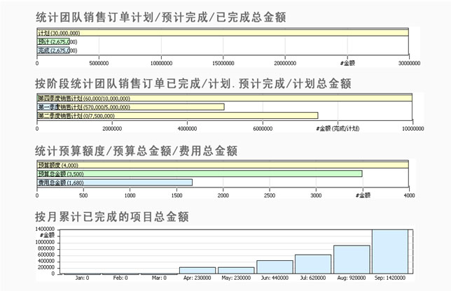 在VamCRM項目組合管理中集成項目數據的統(tǒng)計與分析,可以直接監(jiān)控項目計劃、預計及完成的項目數量、總金額和費用的統(tǒng)計,也可按月累計已完成的項目數量、總金額和費用,直接衡量項目實施的結果與效益。在費用管理模塊中集成費用數據的統(tǒng)計與分析,對于所有費用可以按人及費用類型進行統(tǒng)計,實時知道哪一個人或哪一類費用開銷最多,以及費用與預算的對比分析。