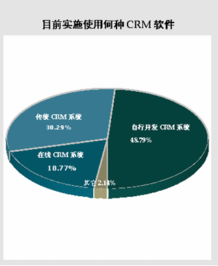 在選擇“已經(jīng)實(shí)施任一CRM軟件”的38.45%的被調(diào)查者中,有48.79%的CRM軟件使用者目前實(shí)施的是“自行開(kāi)發(fā)CRM系統(tǒng)”,而選擇“傳統(tǒng)CRM系統(tǒng)”的為30.29%。雖然市場(chǎng)對(duì)on-demand