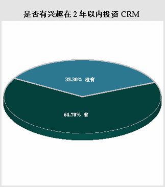在選擇“尚未使用任一CRM軟件”的被調(diào)查者中,當(dāng)被問(wèn)及基于現(xiàn)在的狀況,“是否有興趣在兩年以內(nèi)投資CRM”。有64.70%的被調(diào)查者選擇有興趣在兩年內(nèi)投資CRM軟件,而選擇沒(méi)有興趣在兩年內(nèi)投資CRM軟件的只占35.30%。盡管現(xiàn)在實(shí)際使用CRM軟件的用戶所占比例還不甚理想,但市場(chǎng)前景還是非?春茫蟛糠止揪哂袑(shí)施CRM軟件的需求。