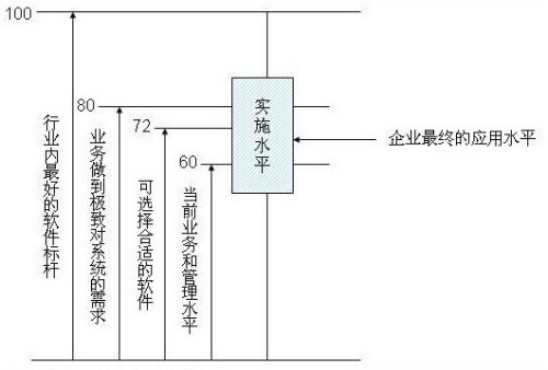 如果用一個數(shù)量化的概念來表達的話,假定行業(yè)內(nèi)最好的軟件是100分,企業(yè)做到極致對系統(tǒng)的需求可能是80分,當(dāng)然也可能沒有一個軟件能滿足企業(yè)所有的需求,但從整體上,一個企業(yè)的主體需求一定在行業(yè)內(nèi)最好的軟件標(biāo)桿之下。而當(dāng)前的業(yè)務(wù)和管理水平一般到不了極致,假設(shè)是60分,那選擇的軟件70-75分一定是合適的,高于當(dāng)前需求,而不要高得太多,最終的實施水平是一個區(qū)間,這取決于實施商的能力和企業(yè)的能力,可能會低于企業(yè)當(dāng)前業(yè)務(wù)和管理水平,也可能使系統(tǒng)超水平發(fā)揮,而企業(yè)最終的應(yīng)用水平一般就在這個區(qū)間里游動了。這個模型看起來很理論化,操作時需要考慮很多的因素,但是非常有價值的判斷標(biāo)準(zhǔn)。