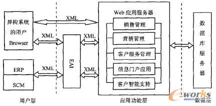 包括ERP、SCM等其他企業(yè)應(yīng)用在內(nèi)的所有的系統(tǒng)用戶與應(yīng)用功能層的數(shù)據(jù)交換均通過XMI數(shù)據(jù)進(jìn)行傳輸,從而大大減小了各種企業(yè)應(yīng)用系統(tǒng)間的通信阻力,為EAI提供了良好的通信平臺(tái)。Web用戶的客戶端只是“瘦小的”瀏覽器日_數(shù)量不受限制,不需要安裝專門的軟件,這使得凡可以接入Internet的用戶都可以方便、靈活地使用系統(tǒng),大大提升了系統(tǒng)用戶間溝通、協(xié)作的效率。此外,由于CRM應(yīng)用系統(tǒng)是在中央服務(wù)器上實(shí)施和維護(hù)的,對(duì)客戶端的要求遠(yuǎn)沒有C/S結(jié)構(gòu)那么高,集中的軟件實(shí)施和維護(hù)大大節(jié)約了企業(yè)的運(yùn)行成本和維護(hù)費(fèi)用。圖1描述的是筆者所要闡述的適應(yīng)網(wǎng)絡(luò)環(huán)境的基于Web的系統(tǒng)平臺(tái)架構(gòu),這并不意味著CRM應(yīng)用系統(tǒng)完全以這種方式運(yùn)行,事實(shí)上用戶接入CRM系統(tǒng)的方式是多種多樣的,系統(tǒng)還應(yīng)該提供電話、傳真、無線接入等多種接入接口。