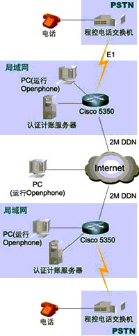 組成這個(gè)IP電話的網(wǎng)絡(luò)系統(tǒng)由處于兩個(gè)不同國(guó)家的區(qū)域組成(見附圖1網(wǎng)絡(luò)拓?fù)浣Y(jié)構(gòu)),每個(gè)區(qū)域都采用了一臺(tái)Cisco 5350路由器(以下簡(jiǎn)稱5350)作為網(wǎng)絡(luò)的核心,這臺(tái)5350路由器具有兩個(gè)WAN口和兩個(gè)以太網(wǎng)口,能夠直接連接到本地的局域網(wǎng)和DDN基帶調(diào)制解調(diào)器。和普通電話網(wǎng)絡(luò)(PSTN)相連接則是通過(guò)添加一個(gè)E1接口卡4PRI和一個(gè)IP語(yǔ)音數(shù)據(jù)處理單元NP60,來(lái)實(shí)現(xiàn)E1(30條ISDN的B信道)和路由器相連接,實(shí)時(shí)地對(duì)語(yǔ)音數(shù)據(jù)進(jìn)行H.323壓縮編碼。