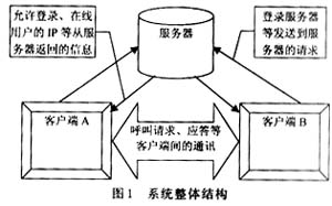 通過設(shè)置一個信令服務(wù)器的方式綜合以上兩種方式的優(yōu)缺點(diǎn)。用戶通話程序工作于半客戶機(jī)狀態(tài),信令服務(wù)器負(fù)責(zé)客戶的集中呼叫。當(dāng)某一個客戶呼叫,服務(wù)器負(fù)責(zé)中轉(zhuǎn)呼叫,當(dāng)被叫客戶響應(yīng)呼叫并應(yīng)答后,自主于呼叫方進(jìn)行通話而不必經(jīng)過信令服務(wù)器,這樣,大幅度地減少了服務(wù)器的數(shù)據(jù)量。有了集中的信令服務(wù)器,也便于客戶的管理,還可進(jìn)行廣播消息的發(fā)布。