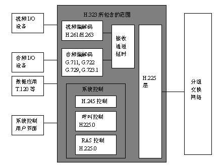為網(wǎng)絡(luò)電話和可視電話會議系統(tǒng)的進一步發(fā)展和系統(tǒng)的兼容性提供了良好的條件。其中系統(tǒng)控制協(xié)議包括H.323、H.245、和H.225.0,Q.931和RTP/RTCP是H.225.0的主要組成部份。系統(tǒng)控制是H.323終端的核心。整個系統(tǒng)控制由H.245控制信道、H.225.0呼叫信令信道和RAS(注冊、許可、狀態(tài))信道提供,音頻編解碼協(xié)議包括G.711協(xié)議(必選)、G.722、G.723.1、G.728、G.729等協(xié)議。編碼器使用的音頻標(biāo)準(zhǔn)必須由H.245協(xié)議協(xié)商確定。H.323終端應(yīng)由對本身所具有的音頻編解碼能力進行非對稱操作。如以G.711發(fā)送,以G.729接收。視頻編解碼協(xié)議主要包括H.261協(xié)議(必選)和H.263協(xié)議。H.323系統(tǒng)中視頻功能是可選的。數(shù)據(jù)會議功能也是可選的,其標(biāo)準(zhǔn)是多媒體會議數(shù)據(jù)協(xié)議T.120。其結(jié)構(gòu)如圖所示。