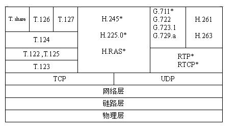 H.323是國際電信聯(lián)盟(ITU)的一個標(biāo)準(zhǔn)協(xié)議棧,該協(xié)議棧是一個有機的整體,根據(jù)功能可以將其分為四類協(xié)議,也就是說該協(xié)議從系統(tǒng)的總體框架(H.323)、視頻編解碼(H.263)、音頻編解碼(H.723.1)、系統(tǒng)控制(H.245)、數(shù)據(jù)流的復(fù)用(H.225)等各方面作了比較祥細(xì)的規(guī)定。
