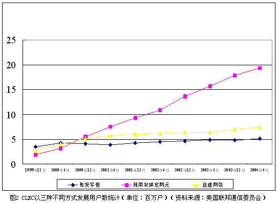 從經(jīng)營模式上看,本地非主導(dǎo)運(yùn)營商的商業(yè)模式在過去的5年中發(fā)生了很大變化。在市場剛剛開始引入競爭的1999年,42.9%的本地非主導(dǎo)運(yùn)營商選擇了批發(fā)零售這種進(jìn)入門檻相對(duì)較低的商業(yè)模式,本地電話市場一度活躍著大量地區(qū)性的小運(yùn)營商。由于面臨本地主導(dǎo)運(yùn)營商的強(qiáng)烈抵制,非綁定網(wǎng)元政策的實(shí)施自公布以來一再推遲,經(jīng)過反復(fù)的法律訴訟,美國最高法院在2002年最終裁定非綁定網(wǎng)元政策合法。自那時(shí)起,AT&T、MCI等全國性的長途電話運(yùn)營商紛紛通過租用非綁定網(wǎng)元的方式進(jìn)入本地電話市場。截止到2004年6月,本地主導(dǎo)運(yùn)營商已經(jīng)提供了約2150萬線非綁定本地用戶線給本地非主導(dǎo)運(yùn)營商。CLEC以三種方式發(fā)展用戶的情況如圖2所示。