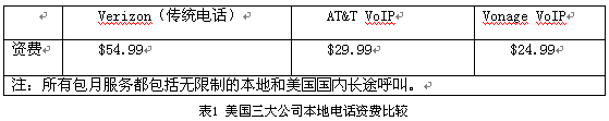 隨著寬帶接入的進(jìn)一步普及,VoIP似乎為打破本地環(huán)路的瓶頸提供了新的選擇,AT&T、Qwest、時(shí)代華納、Verizon等老牌運(yùn)營商紛紛開始提供這項(xiàng)服務(wù)。AT&T于2004年3月在新澤西州和德克薩斯州推出了29.99美元的包月計(jì)劃,其VoIP業(yè)務(wù)不僅包含了基本語音服務(wù),也提供諸如呼叫轉(zhuǎn)移、會(huì)議電話、來電顯示等增值服務(wù),美國三大公司本地電話資費(fèi)如表1所示。