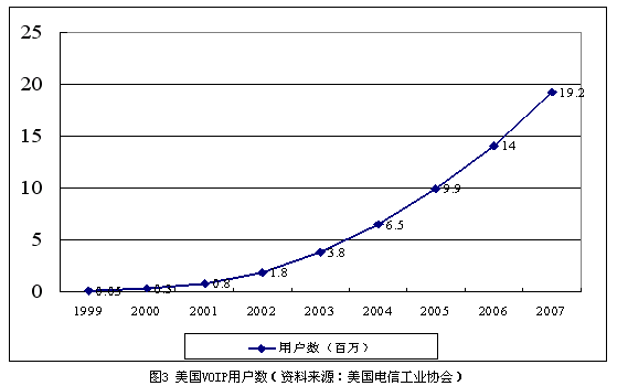 與此同時(shí),Qwest也開始在明尼蘇達(dá)州提供類似的VoIP業(yè)務(wù),并計(jì)劃在近期內(nèi)推向全國。Verizon與北電網(wǎng)絡(luò)簽訂了大筆的訂單,計(jì)劃全面改造其本地電話網(wǎng)絡(luò)提供的VoIP業(yè)務(wù)。一些曾經(jīng)著名的網(wǎng)絡(luò)電話公司(如Net2Phone)也開始進(jìn)入傳統(tǒng)電話市場。截止到2004年2月底,Vonage的全I(xiàn)P網(wǎng)絡(luò)已經(jīng)擁有13萬VoIP用戶。據(jù)美國電信工業(yè)協(xié)會(huì)預(yù)測,到2007年年末,全美的VoIP用戶將會(huì)達(dá)到1920萬戶,如圖3所示。