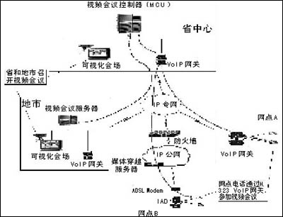 通過(guò)在全省部署VoIP系統(tǒng),網(wǎng)點(diǎn)VoIP網(wǎng)關(guān)可以通過(guò)H.245協(xié)議與視頻會(huì)議MCU(多點(diǎn)控制器)進(jìn)行通信能力的動(dòng)態(tài)協(xié)商,在國(guó)家、省和地市召開(kāi)視頻會(huì)議時(shí),網(wǎng)點(diǎn)可以通過(guò)普通電話(huà)(或者電話(huà)會(huì)議終端)參與會(huì)議,實(shí)現(xiàn)“聽(tīng)聲參會(huì)”,低成本地實(shí)現(xiàn)了行業(yè)視頻會(huì)議系統(tǒng)的延伸。