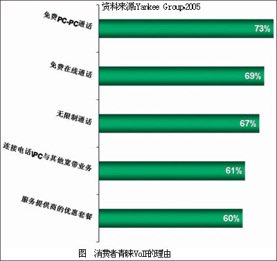 市場(chǎng)調(diào)研咨詢公司Yankee Group日前針對(duì)消費(fèi)者進(jìn)行了一次調(diào)查,結(jié)果顯示:73%的用戶喜歡VoIP是因?yàn)橥ㄟ^(guò)它可以進(jìn)行免費(fèi)的PC對(duì)PC通話;69%的用戶喜歡VoIP在線呼叫的功能;67%的用戶表示,VoIP廉價(jià)的通話費(fèi)用使人們可以無(wú)限制地通話,令人心動(dòng);61%的用戶表示,喜歡通過(guò)VoIP使電話與PC、其他在寬帶網(wǎng)絡(luò)上的一些活動(dòng)捆綁起來(lái);60%的用戶表示被服務(wù)提供商提供的優(yōu)惠套餐吸引。對(duì)于用戶來(lái)說(shuō),VoIP最大的吸引力似乎在于其低廉的話費(fèi)和為人們帶來(lái)的方便。