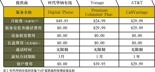 聲稱其1/3的有線電視用戶和一半以上的寬帶用戶訂購了其提供的VoIP服務(wù)。對于時代華納有線的全新VoIP用戶來說,開通并使用“數(shù)字電話”的費(fèi)用為每月49.95美元,那些時代華納有線的寬帶用戶只需44.95美元,如果用戶同時使用有線電視和寬帶,那么只需要39.95美元就可以了,時代華納有線為所有的服務(wù)(視頻、語音和數(shù)據(jù)接入)提供每月統(tǒng)一的賬單。此外用戶使用“數(shù)字電話”不需要簽訂長期合同,并享有30天的試用期,相對于其競爭對手來說賦予了用戶更多的自由。