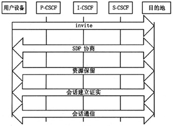 GPRS supporting node,GPRS服務(wù)支持節(jié)點(diǎn))和GGSN(gateway GPRS supporting node,GPRS網(wǎng)關(guān)支持節(jié)點(diǎn))到達(dá)CSCF,經(jīng)過(guò)處理后送往其他IMS網(wǎng)絡(luò)、MGCF/MGW網(wǎng)絡(luò)或外部IP網(wǎng)絡(luò)。在此過(guò)程中,SGSN和GGSN僅查看消息的目的IP地址,不分析消息的內(nèi)容,起到路由器的作用。圖6示出移動(dòng)用戶發(fā)起呼叫的信令流程示例,此處假設(shè)用戶位于訪問(wèn)網(wǎng)絡(luò)。用戶發(fā)SIP