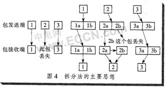 如果某個RTP包在傳輸過程中丟失,那么丟失的只是原數(shù)據(jù)包按采樣間隔的一半信息,接收端可以用接受到的另一半信息,利用插值等方法恢復出原話音包的大部分信息,從而使話音質量不至于下降太多。拆分法的主要思想如圖4所示。
