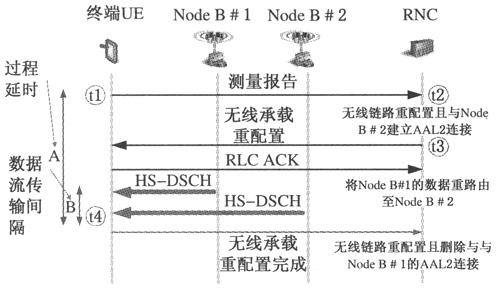 對(duì)于下面的延時(shí)分析,我們假設(shè)信令無(wú)線承載(SRB)在下行映射到HS-DSCH信道上,在上行映射到增強(qiáng)上行鏈路專用信道(E-DCH)上,且TTI均為10ms。HS-DSCH是HSDPA的傳輸信道,E-DCH是HSUPA的傳輸信道。首先,當(dāng)滿足測(cè)量觸發(fā)事件1d(最優(yōu)小區(qū)改變)時(shí),UE在信令無(wú)線承載上發(fā)送測(cè)量報(bào)告。傳輸從t1開(kāi)始,RNC在t2時(shí)刻接收到消息。服務(wù)RNC將為目標(biāo)NodeB保留基站資源和Iub資源。該資源的預(yù)留通過(guò)使用預(yù)配置可以完成得非?臁R坏┵Y源在t3時(shí)刻準(zhǔn)備好,RNC將向UE發(fā)送無(wú)線承載重配置消息,此時(shí)UE還是從源NodeB中接收數(shù)據(jù)。當(dāng)UE對(duì)重配置消息進(jìn)行解碼,并且在有效時(shí)刻t4到期前,UE接收數(shù)據(jù)將從源小區(qū)切換到目標(biāo)小區(qū)。UE開(kāi)始監(jiān)聽(tīng)目標(biāo)小區(qū)的高速共享控制信道(HS-SCCH),HS-SCCH是HSDPA下行的共享控制信道。UE也會(huì)測(cè)量目標(biāo)小區(qū)的信道質(zhì)量,并發(fā)送目標(biāo)小區(qū)的CQI報(bào)告。源小區(qū)該用戶的MAC-hs在小區(qū)切換后將重置,并將緩存的協(xié)議數(shù)據(jù)單元(PDU)刪除。同時(shí)目標(biāo)小區(qū)MAC-hs中的流控單元開(kāi)始從服務(wù)RNC中請(qǐng)求PDU,這樣便可以通過(guò)HS-DSCH向用戶發(fā)送數(shù)據(jù)。在小區(qū)切換過(guò)程中,RNC可以同時(shí)向兩個(gè)Node