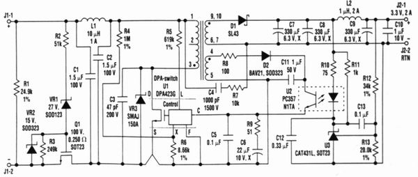 整個(gè)電源效率為78%,這樣1個(gè)簡單的反激電源能提供3.3V(2A)。對大多數(shù)應(yīng)用來講,低成本和簡單化是最重要的特性。假若采用同步整流正激轉(zhuǎn)換器拓?fù)浜途哂休^低通導(dǎo)功耗、較高功率的器件DPA424G,則電路效率可增加5%~10%。