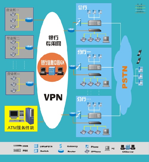 3、如上圖所示,已加裝了PBX的總行或分行,在以前的PBX上加裝GW,使得PBX通過GW進入銀行的數(shù)據(jù)專網(wǎng)并注冊到GK,GK給其分配內(nèi)網(wǎng)的號碼,這樣在不淘汰原有設(shè)備的情況下,有PBX的依然可以與網(wǎng)內(nèi)的其他終端進行零話費通話。
