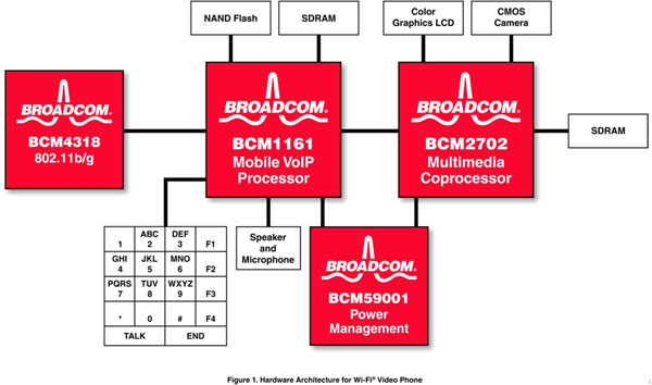 該方法的一個例子如圖1所示。該方案支持接入到本地?zé)o線網(wǎng)絡(luò)的Wi-Fi 接口上的全雙工語音和視頻,它已經(jīng)有了成功的實現(xiàn)案例,并計劃用于一款新型的消費產(chǎn)品設(shè)計。所有高級的呼叫建立和管理、音視頻同步以及應(yīng)用層都在一片BCM1161 VoIP器件上運行。為實現(xiàn)這些功能采用了一片嵌入式通用ARM926E RISC CPU,還有一片嵌入式DSP用于音視頻編解碼和回波消除。利用一個BCM4318E 802.11b/g Wi-Fi無線網(wǎng)絡(luò)接口,BCM1161提供了為實現(xiàn)一個具有成本效益的Wi-Fi手機的語音所需的全部功能。