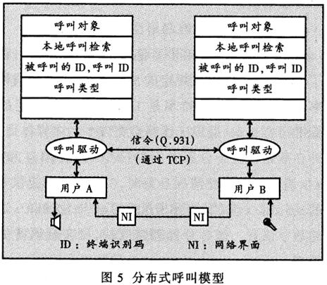 ——IP電話采用分布式的呼叫模式。因為不需要通過電路交換完成呼叫,所以每個終端都使用了呼叫處理器。單工呼叫模式僅支持一個終端的呼叫,且需要本地呼叫驅(qū)動的支持。通過觸發(fā)本地呼叫驅(qū)動軟件建立一次呼叫,而呼叫驅(qū)動利用傳輸控制協(xié)議(TCP)的套接字(Socket)與另一端的呼叫驅(qū)動建立信令連接,從而觸發(fā)另一端的單工呼叫。這兩個單工呼叫被觸發(fā)后按照Q.931信令協(xié)議完成呼叫過程的建立。根據(jù)信令的引導(dǎo),呼叫驅(qū)動程序啟動語音信息流接入網(wǎng)絡(luò)和對端的接收設(shè)備,建立一個完整的呼叫過程(圖5)。圖5中的呼叫對象指明本次呼叫的域名、兩端的終端識別碼(ID)或電話號碼、呼叫類型(如單純語音、語音和數(shù)據(jù))等信息。