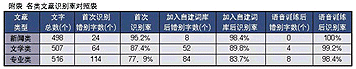 然后,我們又利用聲龍?zhí)赜械脑~匯生成器,讓聲龍自行辨別文章中的詞匯并自動添加到自建詞庫中,并針對其中的一些英文單詞或縮寫對聲龍進(jìn)行語音識別訓(xùn)練,之后我們再次錄入同一篇專業(yè)文章。結(jié)果非常令人滿意,從附表可以看出識別率有了明顯提高。最后,我們又錄入了另一篇相同領(lǐng)域的專業(yè)文章中的一段(512字)。首次錄入的錯別字有46個,識別正確率為91%。與第一篇文章相比,識別率有了明顯提高。