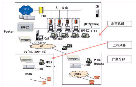 建設(shè)分布式呼叫中心系統(tǒng),從技術(shù)角度講,關(guān)鍵在于單點系統(tǒng)平臺、多點之間聯(lián)網(wǎng)和路由以及整個系統(tǒng)的統(tǒng)一管理三個方面。對于單點系統(tǒng)平臺的選擇,需要結(jié)構(gòu)簡單、投資適中、易于建設(shè),還需要采用開放式結(jié)構(gòu),以易于聯(lián)網(wǎng)、智能路由和統(tǒng)一管理;對于多點之間聯(lián)網(wǎng),一般數(shù)據(jù)通過廣域網(wǎng)傳遞,語音可以通過公共電話網(wǎng)(市話網(wǎng)和長話網(wǎng))傳遞,也可以采用VoIP技術(shù)與數(shù)據(jù)同在廣域網(wǎng)上傳遞;對于多點之間的智能路由和統(tǒng)一管理,物理上分布的多個系統(tǒng)完全可以看成邏輯上的一個系統(tǒng),利用專門的軟件實現(xiàn)統(tǒng)一管理和智能路由,包括呼叫前/后路由、智能呼叫溢出、坐席信息傳播、統(tǒng)一的實時狀態(tài)監(jiān)控和報表生成等,實現(xiàn)多個系統(tǒng)之間的負(fù)載均衡和災(zāi)難備份。