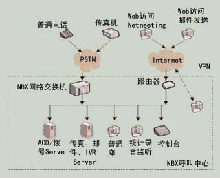 NBX呼叫中心是基于3Com公司NBX網(wǎng)絡(luò)電話交換機平臺構(gòu)筑的、語音數(shù)據(jù)合一的呼叫中心。系統(tǒng)配置拓撲結(jié)構(gòu)如圖3所示。
