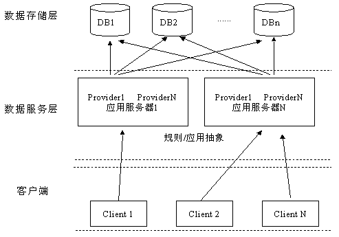 在大規(guī)模系統(tǒng)中,為保證數(shù)據(jù)庫訪問的效率和安全性,數(shù)據(jù)訪問方式一般采用由Client、中間層應用服務器(或叫規(guī)則服務器)和Server組成的三層Client/Server結(jié)構(gòu)。將數(shù)據(jù)庫應用劃分為邏輯上的三個層次,客戶程序只關(guān)心數(shù)據(jù)的顯示與用戶界面;應用服務器處理客戶數(shù)據(jù)查詢與更新請求,可在應用服務器上定義數(shù)據(jù)操作規(guī)則以保證數(shù)據(jù)操作的合法性、安全性與有效性。在三層結(jié)構(gòu)下,方便了軟件的修改和模塊的疊加,客戶端通過應用服務器訪問數(shù)據(jù)庫服務器,客戶端并不直接與數(shù)據(jù)庫服務器建立連接,從而減輕了數(shù)據(jù)庫服務器的壓力,提高整個應用系統(tǒng)的運行效率。