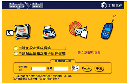 使用Internet瀏覽器的用戶(hù)可以通過(guò)中華電信超級(jí)信箱的專(zhuān)用網(wǎng)頁(yè)來(lái)接入。當(dāng)然,您需要輸入使用名和密碼。