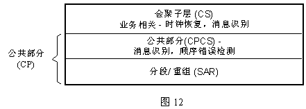 ATM適配層,是ATM核心(包括ATM層和物理層,與業(yè)務(wù)無關(guān))和高層間的接口(見圖5),它是為使ATM層能適應(yīng)不同業(yè)務(wù)類型而設(shè)置的,故ATM對各種業(yè)務(wù)承載能力集中體現(xiàn)在ATM適配層。ATM適配層又細分為若干子層。具體如下圖12。