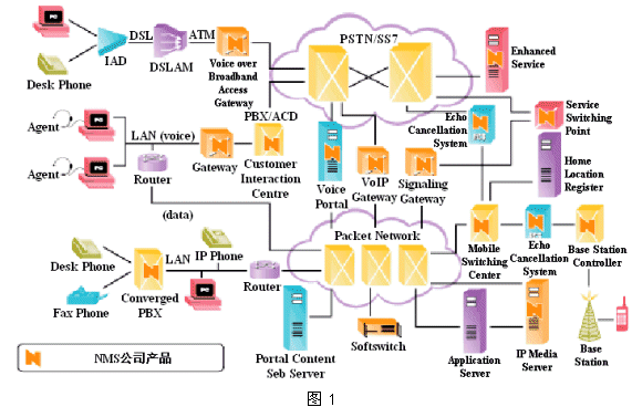 其具體技術內(nèi)容包括:語音IP (VoIP)、語音DSL (VoDSL)和語音無線本地環(huán)路(VoWLL);以及用于確保IP語音、視頻和數(shù)據(jù)通信性能的其他技術。圖1顯示了NMS公司的產(chǎn)品在整個通信應用(包含PSTN網(wǎng)絡和IP分組網(wǎng)絡)中的位置。