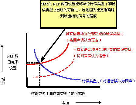 dB)能夠顯著降低將雙對話語音信號誤認為聲學回聲信號的概率,從而防止了"錯誤類型2"?傊,在"錯誤類型1"(實線曲線,具有語音增強特性)和"錯誤類型2"曲線的交叉點上,通過與之對應的NLP設置,可以獲得最佳的性能(請參見圖10)。