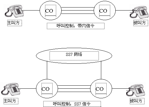 在任一個電話系統(tǒng)中,都要規(guī)定一些固定的信令機制來實現(xiàn)呼叫的建立和釋放。最初,象POTS(普通舊電話業(yè)務(wù))那樣的電話系統(tǒng)都是用帶內(nèi)信令來傳遞信息。帶內(nèi)信令是指信號的頻率在話音頻率范圍之內(nèi)(0.3~3.4kHz),比如:DTMF信號就屬于帶內(nèi)信號。帶內(nèi)信號是在話音通道內(nèi)傳遞的。相反,SS7使用一個完全獨立于話音網(wǎng)的數(shù)據(jù)網(wǎng)來傳遞信令,這樣可以大大提高電話網(wǎng)絡(luò)的利用率。比如,在呼叫發(fā)起但未建立完成之前,不需要分配話音電路,這使得傳遞的信令數(shù)據(jù)只和呼叫有關(guān)而和電路無關(guān),為在交換機之間、交換機和其它網(wǎng)絡(luò)之間高效、可靠地傳遞信息提供了可能。同時也支持更高級的應(yīng)用,如:主叫識別、無線漫游和800號業(yè)務(wù)。如下圖1,顯示出了帶內(nèi)信令和SS7在呼叫接續(xù)上的區(qū)別。