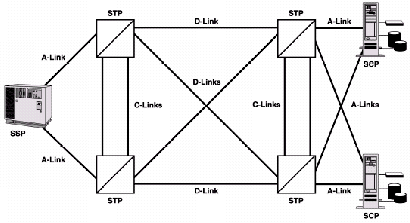 SS7提供消息傳遞以實現(xiàn)正確無誤的業(yè)務(wù)功能,如呼叫建立。因此,SS7被設(shè)計成能達(dá)到相當(dāng)高的可靠性?煽啃詠碜枣溌返亩鄻有院腿哂鄠浞。圖4說明了一個簡單SS7網(wǎng)絡(luò)的標(biāo)準(zhǔn)例子,著重說明了一些內(nèi)建的可靠性特征,比如鏈路的網(wǎng)狀配置,這樣使得網(wǎng)絡(luò)中的每個信令點間都有冗余備份的鏈路,從而提高了整個網(wǎng)絡(luò)的可靠性。
