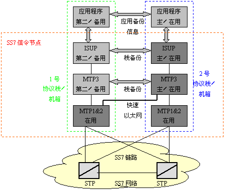 只有SS7鏈路出現(xiàn)故障時,SS7協(xié)議才有相應(yīng)的規(guī)則去處理故障,對其它故障的處理必須在設(shè)計SS7平臺和整個系統(tǒng)結(jié)構(gòu)時予以考慮。還有一個普遍的要求是:軟件的升級過程中不能影響整個系統(tǒng)的運行。能達(dá)到以上要求的一個解決方案是:使用兩個主機箱,在每個主機箱里插有SS7接口板,用于支持一條或多條SS7鏈路。讓兩個主機都使用一個SS7地址,也就是共用一個信令點編碼,這樣遠(yuǎn)端的交換機或STP就會認(rèn)為這兩個主機是一個完整的系統(tǒng)。這樣,這兩個主機組成的系統(tǒng)就能在其中一個出現(xiàn)故障時仍能正常工作。